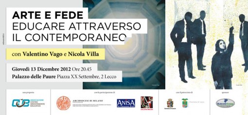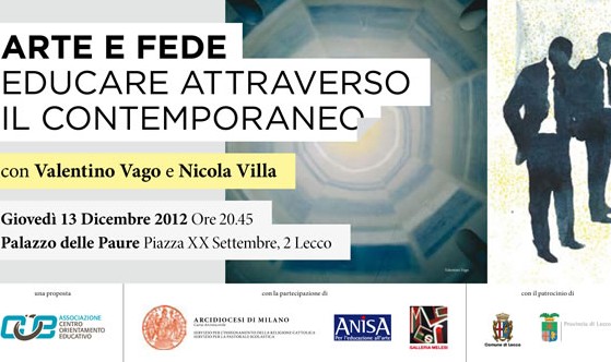 LECCO – “Arte e Fede. Educare attraverso il contemporaneo”. Questo il titolo dell’incontro in programma per questo giovedì 13 dicembre alle 20.45 presso il Palazzo delle Paure, in piazza XX Settembre. Organizzata dal Centro Orientamento Educativo e patrocinata dal Comune di Lecco, l’iniziativa si propone come un’occasione per riflettere sul tema dell’educazione alla fede attraverso l’arte e vedrà intervenire due artisti lombardi: il milanese Valentino Vago e il lecchese Nicola Villa.