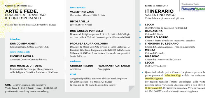 Al termine della tavola rotonda sarà offerto un drink natalizio presso la Galleria Melesi di via Mascari 54, mentre per il 16 marzo 2013 è infine in programma un itinerario sull’arte sacra di Valentino Vago in Lombardia, organizzato da Rusconi Viaggi, sponsor dell’intera iniziativa.
