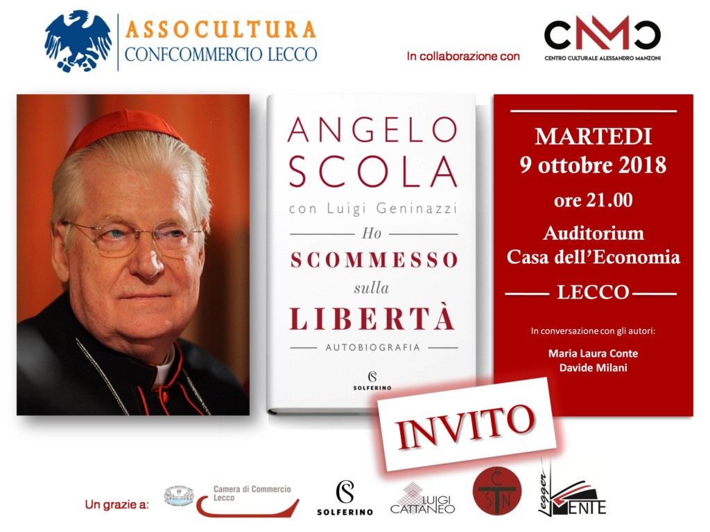 LECCO – Mancano meno di due settimane all’incontro con il Cardinale Angelo Scola, organizzato da Assocultura Confcommercio Lecco in collaborazione con il Centro Culturale Alessandro Manzoni e con il sostegno della Camera di Commercio di Lecco, della Casa Editrice Solferino, del Centro San Nicolò, della Libreria Cattaneo e di Leggermente.