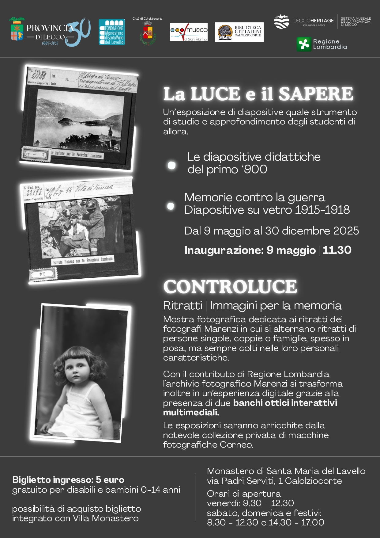 Nello spazio espositivo “Elena Gandolfi” del Monastero di Santa Maria del Lavello, oltre alla mostra “La Luce e il Sapere” vengono presentati anche l’Archivio fotografico Marenzi di Calolziocorte con la mostra “Controluce” a cura dal Comune di Calolziocorte e la collezione privata Corneo di macchine fotografiche che descrivono la storia della fotografia dal 1890 al 1930 circa, con esemplari particolarmente rari e interessanti.
