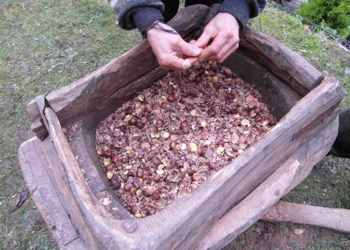 Terminata la fase di essiccazione, arriva il momento della battitura: le castagne vengono versate in una “pila” ricavata da un tronco e battute ritmicamente da quattro persone con mazze di legno. È un gesto antico, quasi una danza collettiva, che richiama il tempo in cui lavoro, tradizione e comunità erano inscindibili.