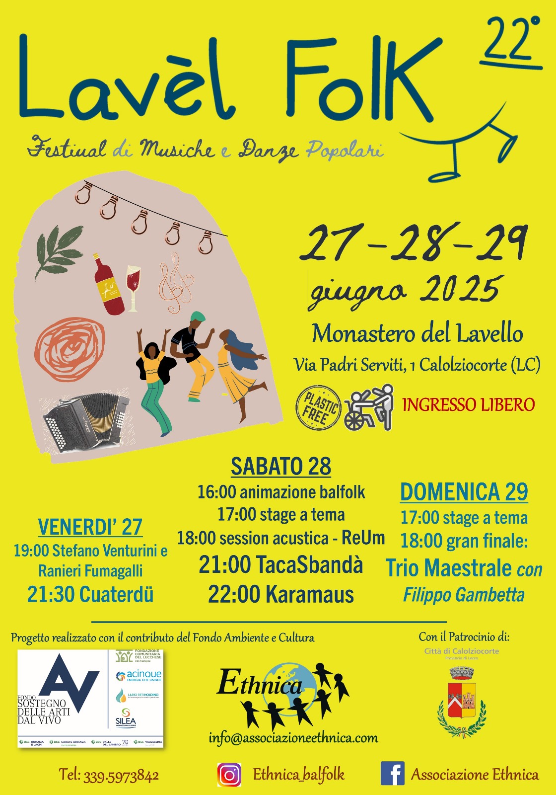 CALOLZIOCORTE – Ethnica – Associazione Culturale Balli e Musiche Popolari aps organizza la 22^ edizione del Lavélfolk nei giorni 27,28 e 29 giugno presso gli spazi del Monastero S. Maria del Lavello di Calolziocorte, con il patrocinio e il contributo della Città di Calolziocorte e la collaborazione della Fondazione del Monastero del Lavello. L’associazione Ethnica ringrazia la Fondazione Comunitaria del Lecchese per averci accordato un finanziamento. Il progetto è stato realizzato con il contributo del Fondo Ambiente e Cultura (Acinque Energia – Fondazione Comunitaria del Lecchese – Lario Reti Holding – Silea). La kermesse sarà un’occasione di festa, dove, durante i tre giorni danza, musica, cultura e solidarietà troveranno il loro spazio lungo le sponde dell’Adda.