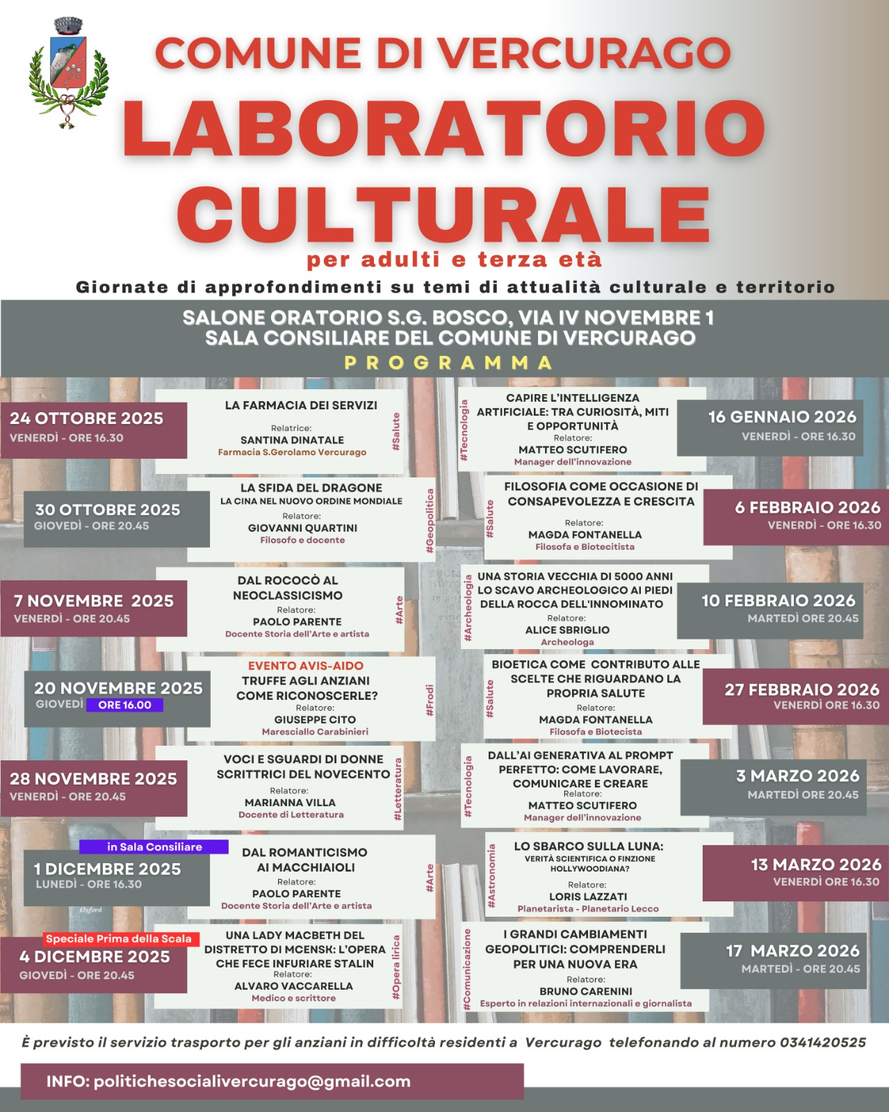LECCO – E’ iniziato il nuovo ciclo del Laboratorio Culturale per adulti e terza età organizzato dal Comune di Vercurago con la Commissione politiche sociali. Il programma è molto vario e ricco di interventi qualificati su argomenti che spaziano dall’arte alla geopolitica e alla comunicazione, dalle nuove tecnologie alla salute.