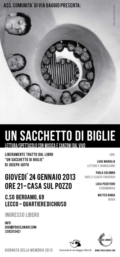 “Un sacchetto di biglie”, questo il titolo dello spettacolo con musiche e canzoni dal vivo che si terrà stasera, giovedì 24 gennaio, presso la Casa sul Pozzo di corso Bergamo 69. A partire dalle 21, l’attore Gigi Maniglia, accompagnato dai musicisti Paola Colombo (alla voce e al flauto traverso) e Luca Pedeferri (alla fisarmonica), si cimenterà quindi in uno spettacolo liberamente tratto dall’omonimo libro di Joseph Joffo, il tutto per la regia di Matteo Binda. In sintesi un mix di recitazione, letture e musica promosso dall’associazione Frasi Lunari.