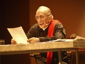 In una scena minimale, essenziale: un leggio, un tavolo bianco impegnato solo da fogli, da una caraffa di acqua e dalla sua immancabile scarpa rossa, Don Gallo è padrone della scena, nel suo pur saltellare precario per tutto il palco, non recita, racconta, condivide, sprona, legge Savonarola che parla ai fiorentini di 500 anni fa, di schiavitù delle cose, della bramosia dei soldi, dell’avidità, dell’egoismo, del sesso e delle escort, “come mai le ragazze si offrono ai potenti e le madri dietro bisbocciano?” dei poteri e dei servi. “Cosa siete servi? No, dovete essere cittadini e non tacere”