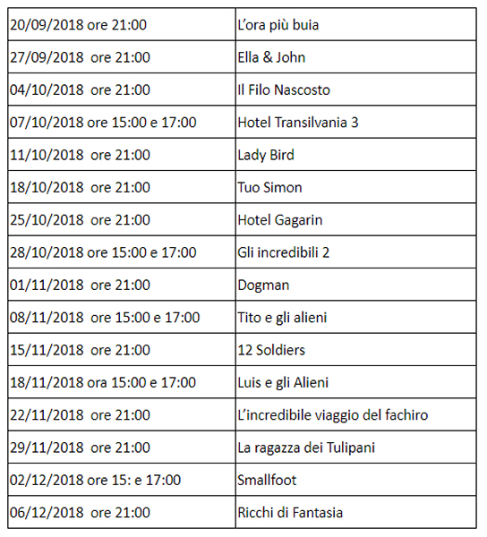 La rassegna di cinema “Autunno 2018” avrà però il suo inizio ufficiale il 20 settembre con il primo dei sedici appuntamenti in programma, “L’ora più Buia” diretto da Joe Wright e incentrato sulla figura di Winston Churchill, da pochi giorni Primo ministro della Gran Bretagna alla prese con la decisione più difficile della sua vita: negoziare la pace con la Germania nazista o continuare la guerra.