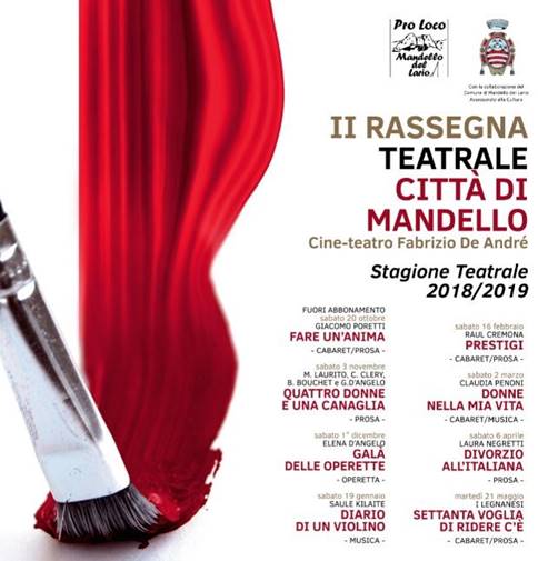 A novembre inizierà invece la Rassegna Teatrale, con sette spettacoli e volti noti del teatro e della televisione, che terranno compagnia ai mandellesi fino alle soglie della prossima estate. Il costo dell’abbonamento in questo caso è di 100 euro con prevendite disponibili fino al 21 ottobre. Fuori abbonamento sarà invece l’incontro con Giacomo Poretti (del trio Aldo, Giovanni e Giacomo) a Mandello il 20 ottobre con il suo monologo “Fare un’anima” , con biglietto singolo al costo di 10 euro.