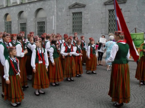 La manifestazione ha sancito il suo inizio con il raduno degli undici giovani cori, provenienti da altrettanti Paesi europei, in Piazza Garibaldi a Lecco e, dopo le foto di rito con le bandiere della loro nazione che sventolavano maestose – aiutate anche dal vento incessante- i gruppi si sono ordinati per la tradizionale sfilata in costume.