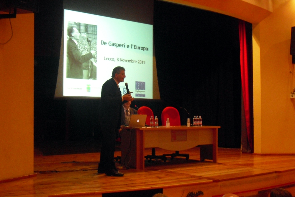 De Gasperi e l’Europa. Su questi temi si è svolto in mattinata un convegno in Sala Ticozzi che ha visto la partecipazione di molti studenti lecchesi. Presente all’evento Maria Romana De Gasperi, presidente della Fondazione De Gasperi di Roma e figlia dello statista Alcide che, con Konrad Adenauer e Robert Shuman, è considerato il padre dell’Europa unita. L’incontro è stato moderato da Paolo Gulisano del Centro Culturale San Nicolò di Lecco e ha visto la partecipazione di monsignor Franco Cecchin, del sindaco di Lecco Virginio Brivio e dell’assessore all’Istruzione Francesca Bonacina, oltre ai promotori dell’evento Domenico Ceppi, vicedirettore della filiale lecchese del Credito Valtellinese, e Francesco Rotta,