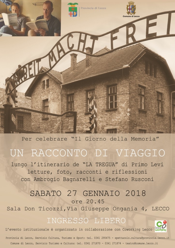 L’Assessore alla Cultura del Comune di Lecco Simona Piazza aggiunge: “In occasione del Giorno della Memoria, in collaborazione con la Provincia di Lecco e grazie alla sensibilità di Coworking Lecco, presso la sala Don Ticozzi di Lecco verrà proposto un racconto di viaggio lungo l’itinerario de ‘La Tregua’ di Primo Levi: letture, foto, racconti e riflessioni con Ambrogio Bagnarelli e Stefano Rusconi. La serata ci consente non solo di ricordare il drammatico sterminio di persone messo in atto durante il secondo conflitto mondiale, ma anche, e soprattutto, di riflettere sul male stesso e, come spiega Hannah Arendt, sulla sua banalità e dunque sulla capacità umana di comprenderne fino in fondo la portata. Questo perché crediamo che sia importante non soltanto ricordare, ma anche, e soprattutto, capire”.