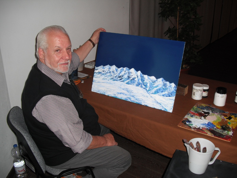 Nella foto il pittore ad opera compiuta e Mario Corti alla consegna dei guidoncini al Coro Valsassina.