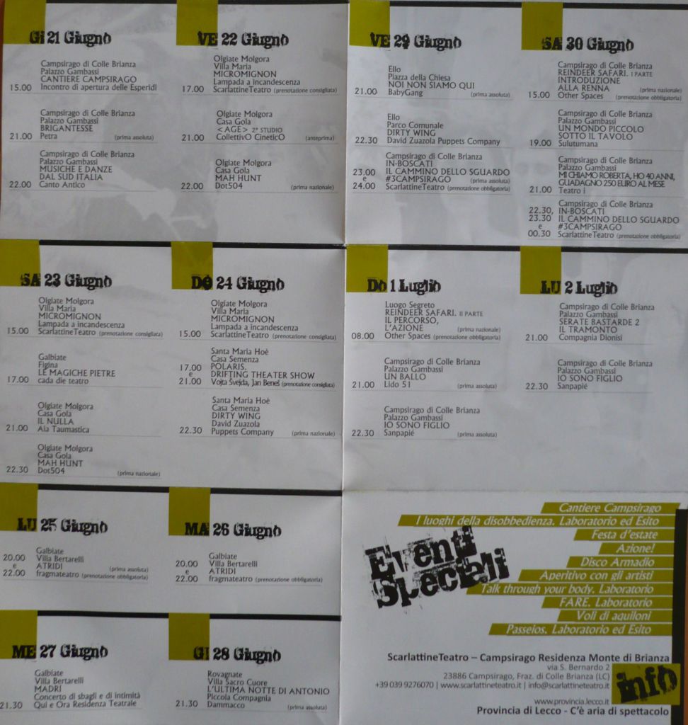 “Abbiamo scelto di distinguere tre filoni – ha spiegato Losi – Il primo week-end (dal 22 al 24 giugno) sarà, infatti, caratterizzato dalla danza e dal teatro fisico. Accanto ai Dot504 non si può tralasciare la prima nazionale di Dirty Wing di David Zuazola, spettacolo vincitore al Festival Internazionale del Teatro di Figura per Adulti di Varsavia 2011 (il 24 giugno a Santa Maria Hoè). La seconda parte del festival sarà dedicata alla nuova drammaturgia contemporanea italiana, mentre la terza punterà l’attenzione sulla relazione tra teatro, danza, uso del corpo e natura”.
