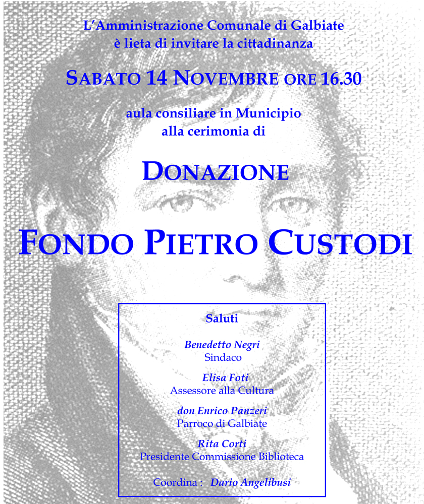 Mons. Daniele Rota Professore emerito, docente di letteratura italiana presso l’Università di Bergamo, promotore del convegno nazionale di studi su Pietro Custodi, tenutosi nell’ottobre 1987 a Milano, Lecco e Galbiate (Monte Barro) e curatore degli inediti custodiani, ha comunicato di voler donare al Comune di Galbiate l’ingente materiale documentario in suo possesso.