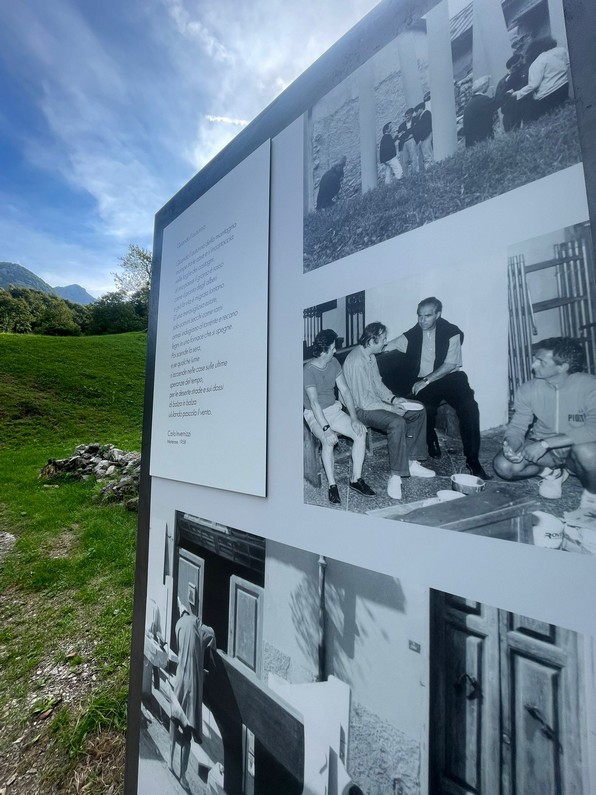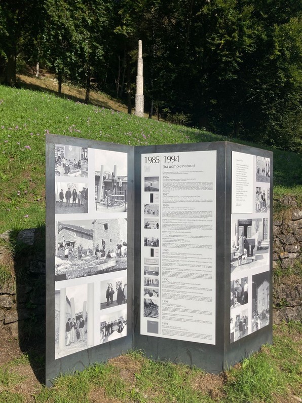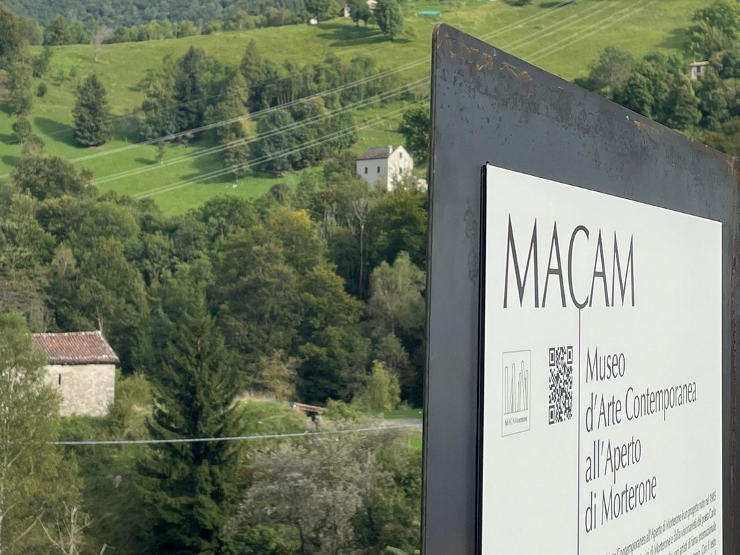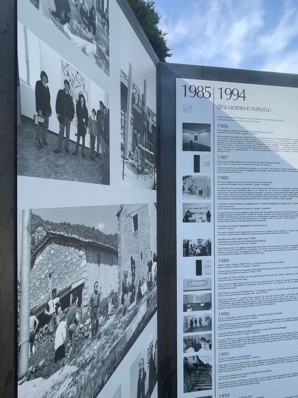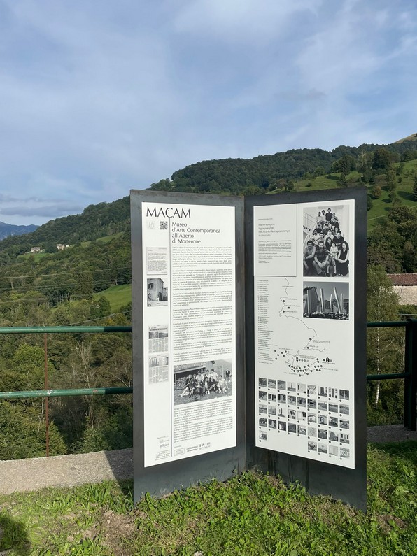 permanenti disseminate sul territorio, partendo dalla piazza della Chiesa sino alla Casa dell’Arte. Il percorso – incentrato sulla nascita e gli sviluppi dell’associazione culturale morteronese a partire dal 1985, anno della sua fondazione, fino ad oggi – prende corpo come una reale linea del tempo attraverso immagini fotografiche di archivio, documenti, cataloghi, testi e poesie. Il totem introduttivo, partendo da una lettera del 1985 del poeta Carlo Invernizzi, racconta i primi passi circa l’intento di portare l’arte a Morterone; le quattro strutture successive – suddivise per decenni – scandiscono l’attività svolta in quarant’anni dall’Associazione Culturale Amici di Morterone, mettendo in evidenza non le opere che oggi si possono ammirare bensì le persone, il lavoro dietro le quinte, il processo che ha portato alla straordinaria realizzazione del MACAM – Museo d’Arte Contemporanea all’Aperto di Morterone e della Casa del’Arte. Il creativo Giuseppe Villa, staccandosi da una narrazione prettamente tecnico/artistica ha rivelato gli aspetti più umani che che hanno portato alla nascita e crescita a Morterone di una esperienza unica.