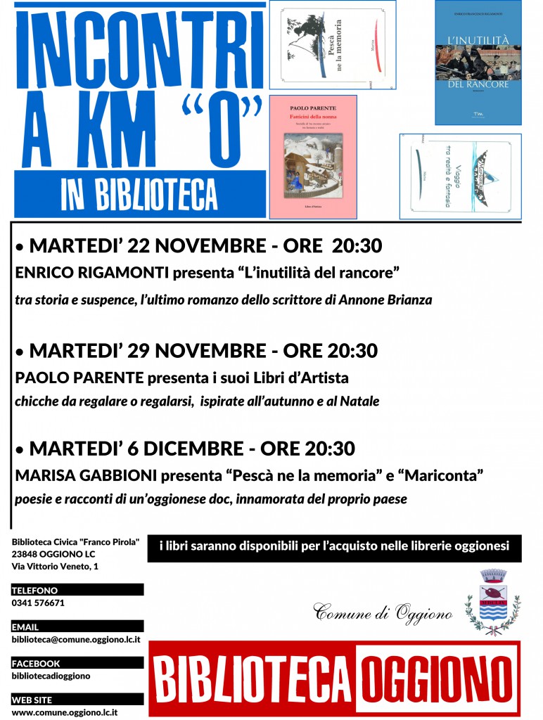 OGGIONO- Primo appuntamento dell’iniziativa “INCONTRI A KM “0”, fissato per martedì 22 novembre, alle ore 20:30, presso la Biblioteca Civica “Franco Pirola” di Oggiono.