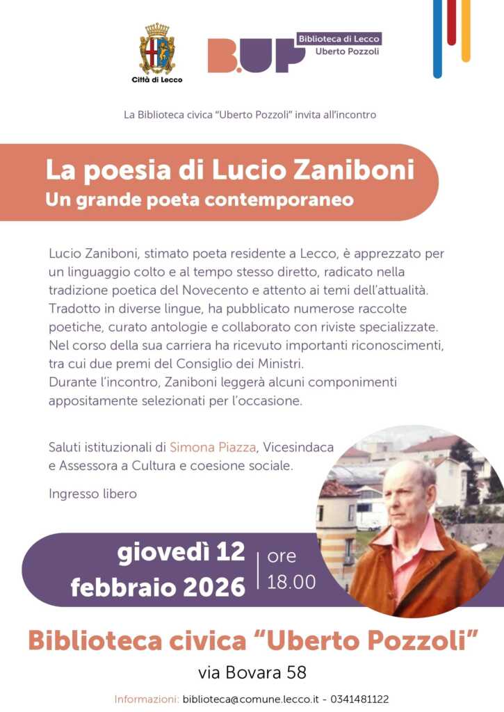 LECCO – La biblioteca civica di Lecco organizza un incontro dal titolo “La poesia di Lucio Zaniboni. Un grande poeta contemporaneo”, in programma giovedì 12 febbraio alle 18.