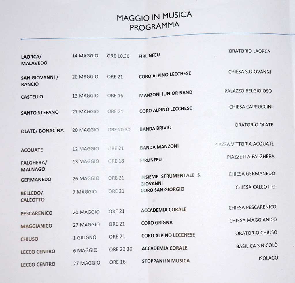 L’Accademia Corale, il Coro Alpino Lecchese, la Manzoni Junior Band, la Banda Brivio e la Banda Manzoni, i Firlinfeu, l’Insieme Strumentale del Coro San Giovannio e Stoppani in Musica si esibiranno tra piazze, chiese e oratori delle parrocchie rionali, nei 14 appuntamenti in programma (vedi qui).