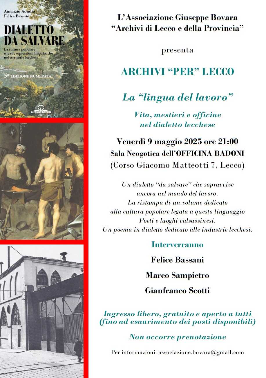 LECCO – Un incontro dedicato al dialetto lecchese, una lingua creduta scomparsa ma che in realtà permea la quotidianità di molte persone, è quello che si terrà presso la Sala Neogotica dell’Officina Badoni alle 21.00 di Sabato 9 Maggio. L’appuntamento con il fenomeno dialettale rientra nel ciclo Archivi “per” Lecco, promosso dall’Associazione Giuseppe Bovara – “Archivi di Lecco e della Provincia”. L’ingresso è libero e aperto a tutti.