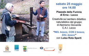 Alle ore 14 di sabato 25 maggio, con ritrovo sul piazzale della funivia di Erna, prenderà il via un momento di creatività denominato “NEL bosco, CON il bosco, DAL bosco”, al quale parteciperà anche l’artista Luisa Rota Sperti. Lungo il sentiero didattico naturalistico recentemente completato dal gruppo di Alpinismo Giovanile del CAI Lecco, sarà possibile ammirare l’esposizione di alcune opere realizzate con elementi naturali eseguite proprio dall’artista lecchese insieme ai ragazzi dell’Alpinismo Giovanile. Per l’escursione è previsto un tempo di camminata variabile tra i 45 e i 60 minuti.