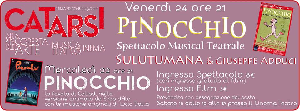 L’appuntamento è per mercoledì 22 Gennaio con il film Pinocchio di Enzo D’alò (“La freccia azzurra”, “La Gabbianella e il Gatto”) con le musiche di Lucio Dalla, ingresso a soli 3 Euro; il venerdì vedrà protagonisti i Sulutumana e Giuseppe Adduci con il loro spettacolo Pinocchio (a ingresso 8 Euro con film omaggio), la resa musical-teatrale della storia di Collodi.