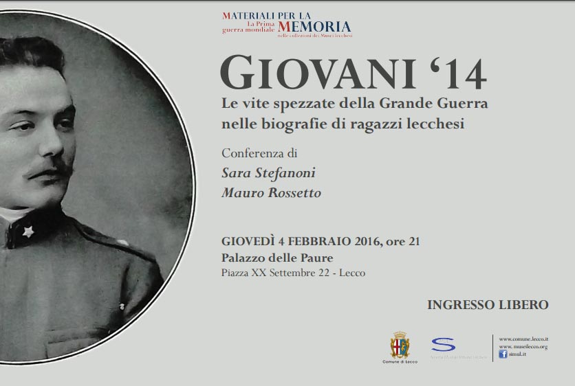 LECCO – Nell’ambito della mostra “Il Patrimonio del Museo storico”, è prevista per giovedì 4 febbraio alle ore 21 a Palazzo delle Paure la conferenza “Giovani ’14 – le vite spezzate della Grande Guerra nelle biografie di ragazzi lecchesi” tenuta dalla giovane ricercatrice lecchese Sara Stefanoni e da Mauro Rossetto, coordinatore del Comitato scientifico della mostra.