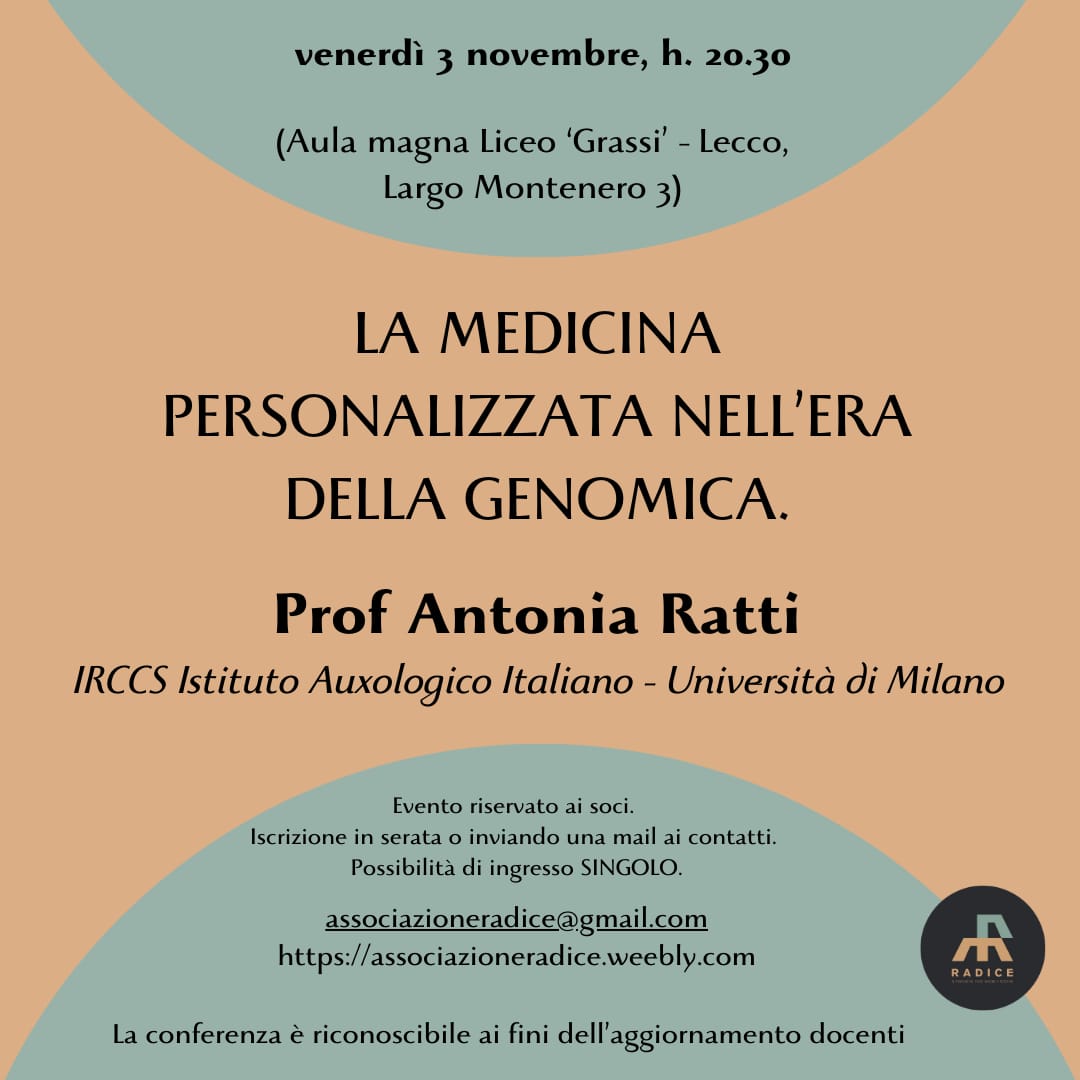 LECCO – “La medicina personalizzata nell’era della genomica”, gli sviluppi della ricerca genetica in campo medico presentati a Lecco. E’ questo il titolo dell’incontro che si terrò venerdì 3 novembre alle ore 20.30, nell’Aula Magna del Liceo ‘Grassi’ di Lecco, in Largo Montenero, 3.