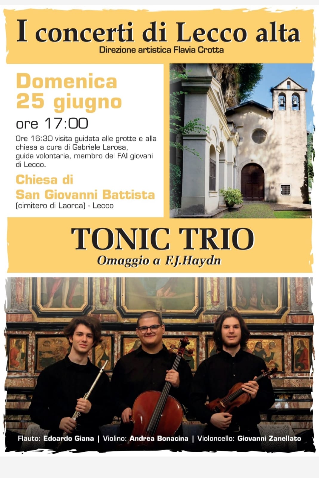 LECCO – Appuntamento con la musica in quel di Laorca, con il concerto del Tonic Trio composto da Edoardo Giana (flauto), Andrea Bonacina (violino), Giovanni Zanellato (violoncello).