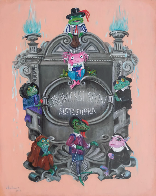 L’artista, nata e cresciuta a Lecco, è sempre stata affascinata dal romanzo di A. Manzoni, da cui prende spunto la serie de “I Promessi Sposi”, nella quale i noti personaggi sono rappresentati da Antonella Ciceri come anfibi volti ad interpretare la connessione tra due mondi a noi visibili (terreno e acquatico).