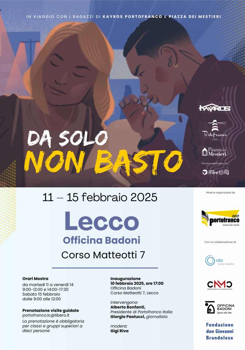 Un’esperienza che sarà possibile conoscere meglio grazie alla mostra “Da solo non basto”, allestita dall’11 al 15 febbraio in l’Officina Badoni in corso Matteotti, 7. La mostra è realizzata attorno ai racconti dello scrittore Davide Mencarelli e illustrata da Giacomo Bettiol. L’esposizione sta facendo il giro d’Italia e nella versione lecchese sarà arricchita da alcuni pannelli che illustrano l’opera di Portofranco in città. Una vera immersione nell’universo giovanile, con l’obiettivo di interpretare l’eco di domande, attese, ferite, desideri e rispondere alle tensioni che lo abitano.