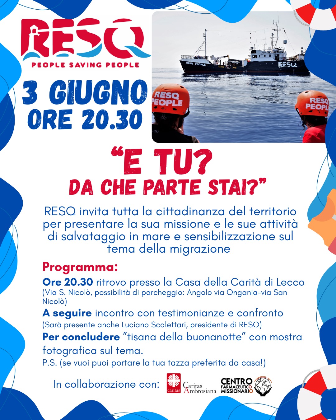 LECCO – Martedì 3 giugno alle ore 20.30, presso la Casa della Carità di Lecco (Via San Nicolò), l’Ong italiana RESQ, tramite l’“equipaggio di terra” di Valmadrera (che opera localmente in sinergia con il Centro Farmaceutico Missionario), invita tutta la cittadinanza ad una serata di incontro e confronto dal titolo “E tu? Da che parte stai?” sul tema della migrazione e dell’accoglienza.