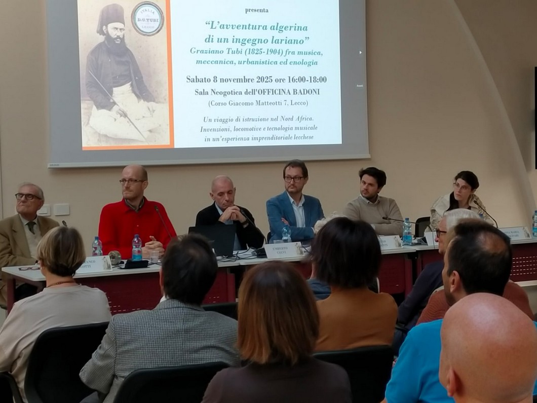 I molteplici aspetti di Tubi sono stati raccontati e approfonditi da diversi relatori: Umberto Calvi ha ricostruito i tratti biografici del personaggio e la esperienza di formazione, cominciata nella casa paterna (ancora si conservano i giochi da tavolo che gli vennero regalati per “esercitare” la mente). Matteo Possenti ha illustrato la complessa vicenda dell’elice applicata alle locomotive per il superamento delle pendenze: una vera e propria sfida tecnologica che vide concorrere diverse società, salvo poi cadere a vuoto per problemi di pratica realizzazione. Paolo Colombo ha invece commentato l’opuscolo firmato da Tubi dedicato a una prima analisi urbanistica del territorio di Lecco, rimarcando come le criticità rilevata da Tubi sono state completamente disattese generando un tessuto urbano disordinato e confuso, ancora in attesa di una propria identità. Della notoria filantropia di Tubi in campo musicale si è occupata Anna Maria Molinari che ha narrato la particolare vicenda riguardante la genesi dell’opera I Promessi Sposi di Errico Petrella, arrivata a compimento grazie al generoso sostegno economico di Tubi che intervenne di sua tasca non solo finanziando il lavoro operistico ma regolando il conto salato presentato dalla famiglia Scola per la permanenza del compositore in Villa Manzoni. Francesco D’Alessio ha sottolineato la precocità di Graziano nel mettere l’accento, in qualità di Deputato del Regno, sulle problematiche connesse alla sicurezza nei luoghi di lavoro, lamentando la scarsa formazione degli operai nel campo della sicurezza e sottolineando la necessità di istituire una commissione esterna di vigilanza. Al termine del partecipato incontro è stato offerto un simpatico e cospicuo buffet ispirato alla cultura algerina e dedicato all’opera rossiniana “L’italiana in Algeri”: il modo giusto per concludere la celebrazione di un personaggio che, come ricordava l’amico scapigliato Vespasiano Bignami, era sì schivo ma pronto ai momenti conviviali con gli amici.