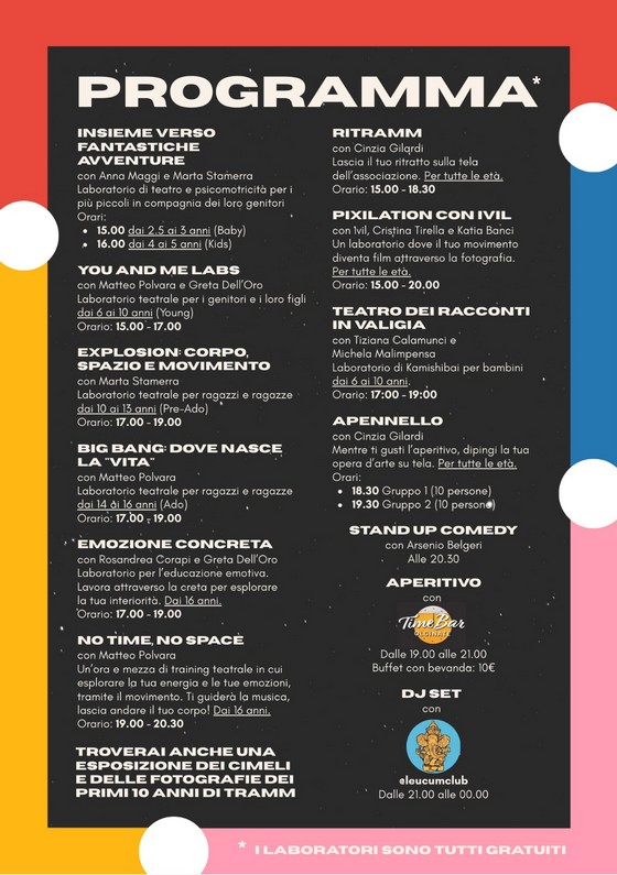 L’evento è gratuito e aperto a tutti. Per partecipare ai laboratori è gradita l’iscrizione tramite il seguente form (CLICCA QUI): “Vi aspettiamo per festeggiare insieme dieci anni di teatro, persone e sogni in movimento”.