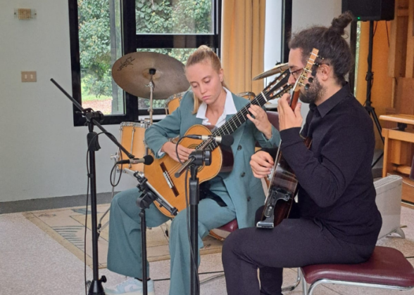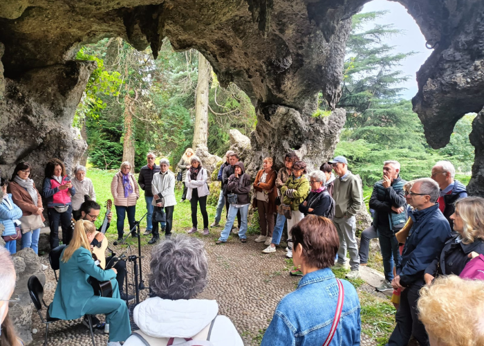 Nella suggestiva e sorprendentemente silenziosa grotta “alla Ludwig”, i visitatori, unanimemente colpiti dalla bellezza del parco, sono stati accolti dalle delicate note del Fluctus Guitar Duo (Luca Bonsanto e Debora Riva), che hanno evocato, in un’atmosfera di autentica emozione, le sonorità ponchielliane.