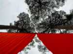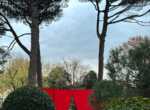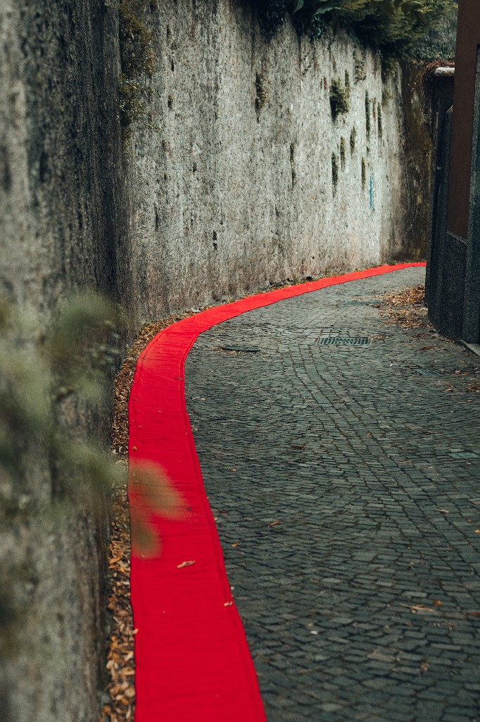 A Villa Gomes, tra i pini marittimi, un grande drappo rosso sospeso a cinque metri d’altezza richiama l’immagine di un sipario aperto sul parco, trasformandolo idealmente in una scena teatrale. Sul lungolago, una striscia di tessuto lunga 100 metri e alta 70 centimetri si intreccia tra 15 platani, creando un corridoio visivo che dialoga con il profilo dell’acqua. In Piazza Era, luogo simbolico della tradizione dei pescatori, un tappeto di foglie rosse prodotte dalle maestranze locali assume la forma di una rete, omaggio diretto alla memoria del luogo.