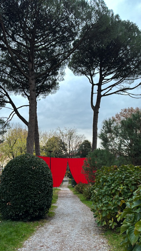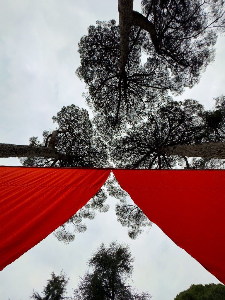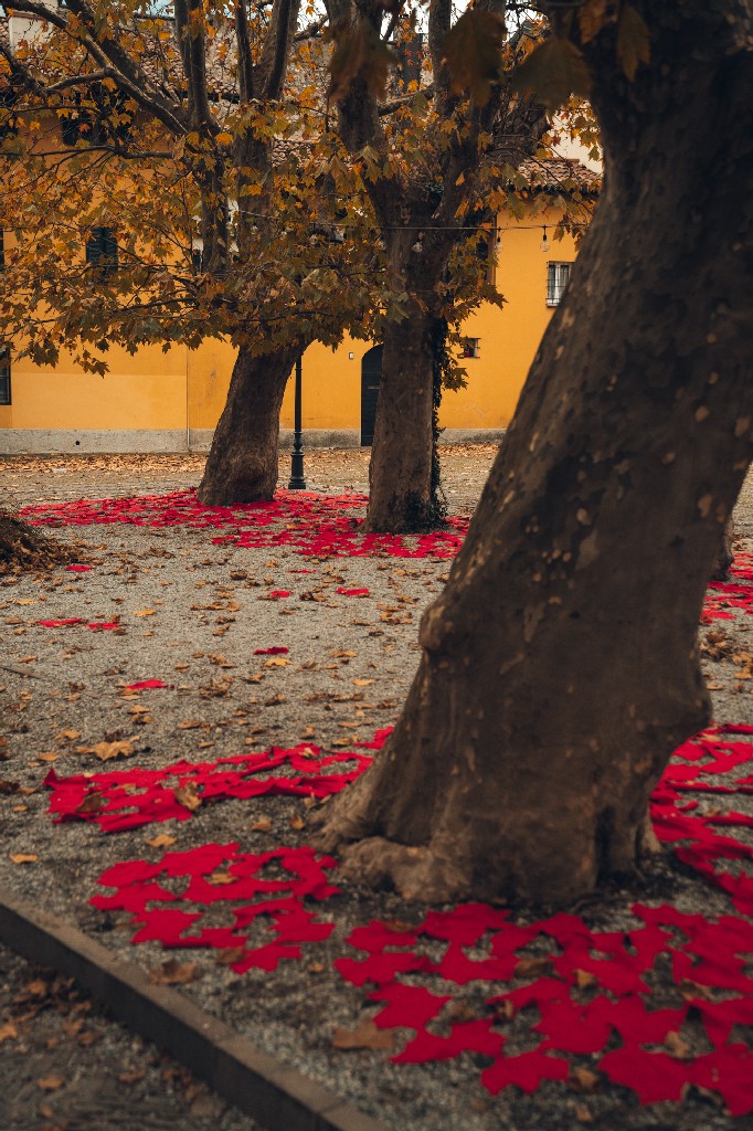 A Villa Gomes, tra i pini marittimi, un grande drappo rosso sospeso a cinque metri d’altezza richiama l’immagine di un sipario aperto sul parco, trasformandolo idealmente in una scena teatrale. Sul lungolago, una striscia di tessuto lunga 100 metri e alta 70 centimetri si intreccia tra 15 platani, creando un corridoio visivo che dialoga con il profilo dell’acqua. In Piazza Era, luogo simbolico della tradizione dei pescatori, un tappeto di foglie rosse prodotte dalle maestranze locali assume la forma di una rete, omaggio diretto alla memoria del luogo.