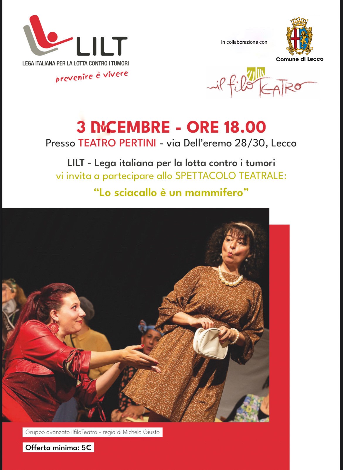 A conclusione dell’iniziativa Nastro Blu – LILT for Men in programma dal 18 al 26 novembre, per incentivare le visite di controllo presso gli ambulatori LILT distribuiti su proprio territorio provinciale e diffondere conoscenza su queste patologie, la LILT Associazione Provinciale di Lecco organizza lo spettacolo “Lo sciacallo è un mammifero”, del Gruppo avanzato IlfiloTeatro con la Regia di Michela Giusto, in programma domenica 3 dicembre ore 18 presso il Teatro Pertini a Lecco.
