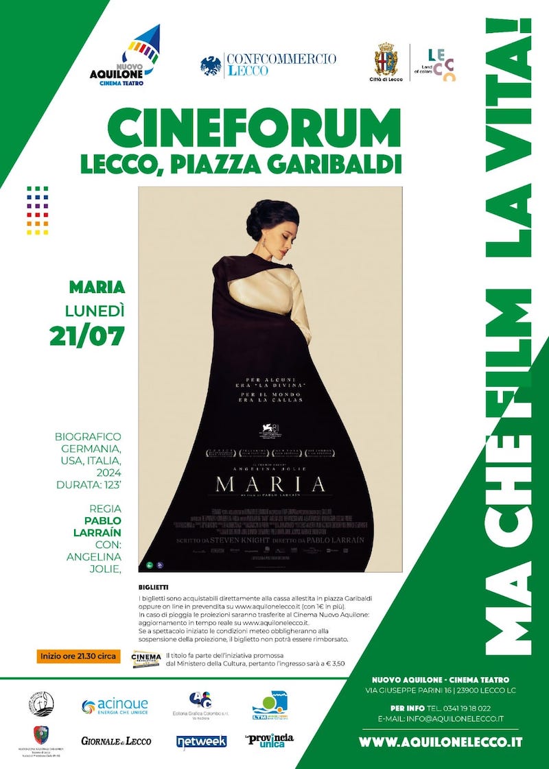 LECCO – Si avvia alla conclusione la settima edizione del cineforum “Ma che film la vita!”, organizzato da Confcommercio Lecco, Nuovo Cinema Aquilone e Comune di Lecco, in collaborazione con la Comunità Pastorale Madonna del Rosario, Acinque, Editoria Grafica Colombo, Ltm e Associazione Nazionale Carabinieri – sezione di Lecco (media partner Giornale di Lecco-Gruppo Netweek e La Provincia-Unica). Dopo l’ottimo successo di pubblico fatto registrare dalla proiezione di “La vita da grandi” del 14 luglio scorso, la rassegna 2025 propone con ultimo film “Maria” diretto da Pablo Larrain: appuntamento lunedì 21 luglio sempre alle ore 21.30 in piazza Garibaldi (tempo permettendo).