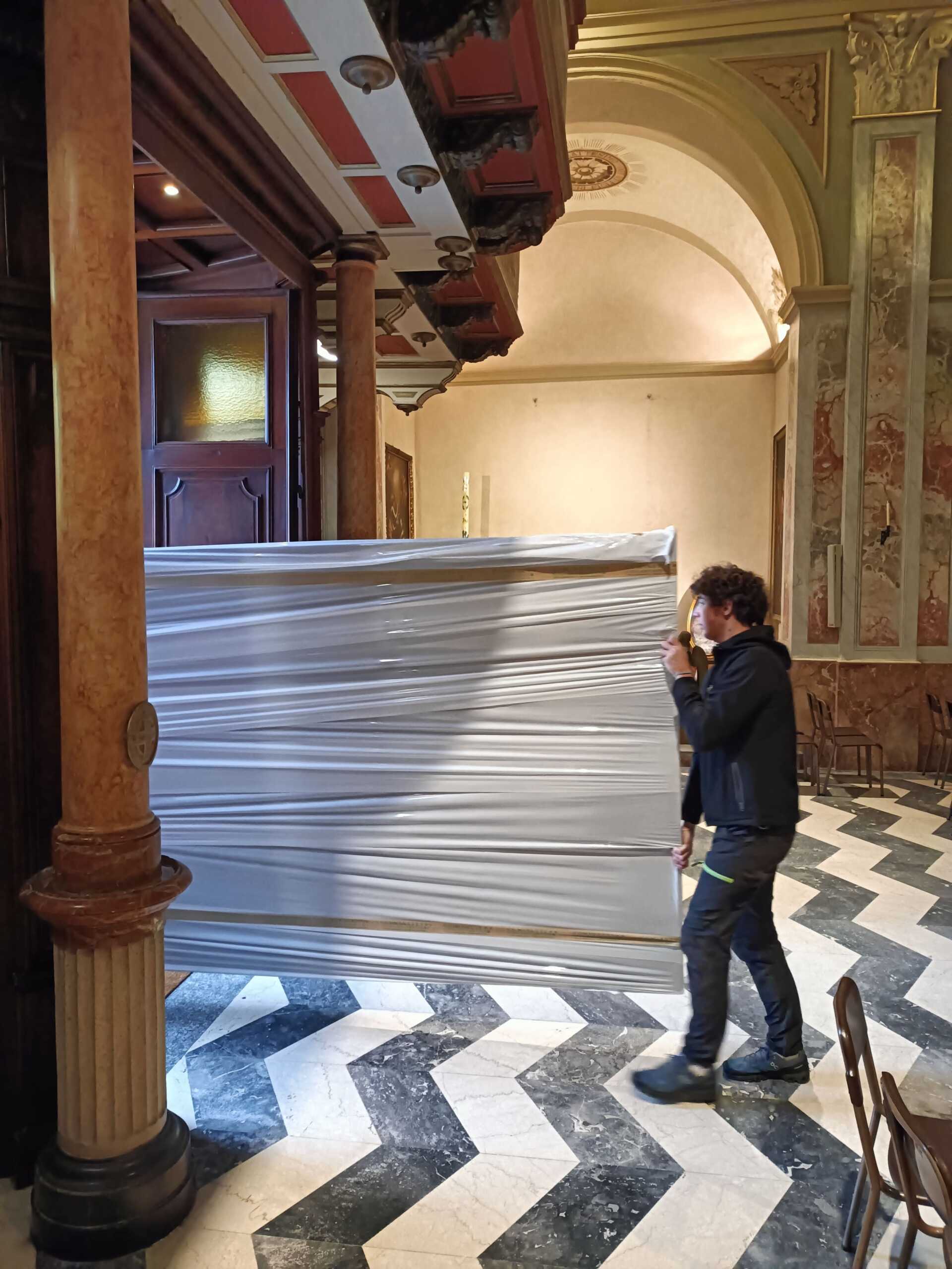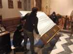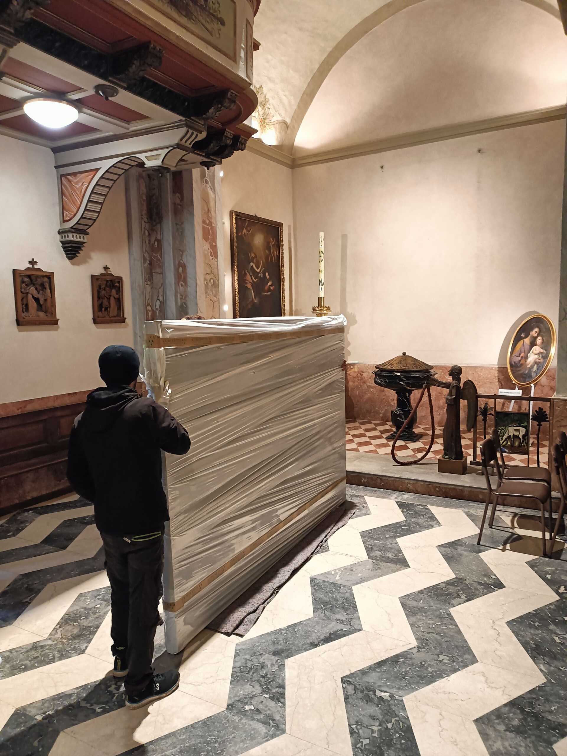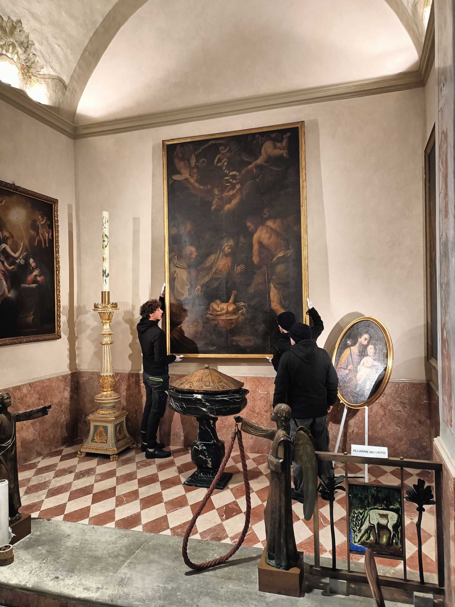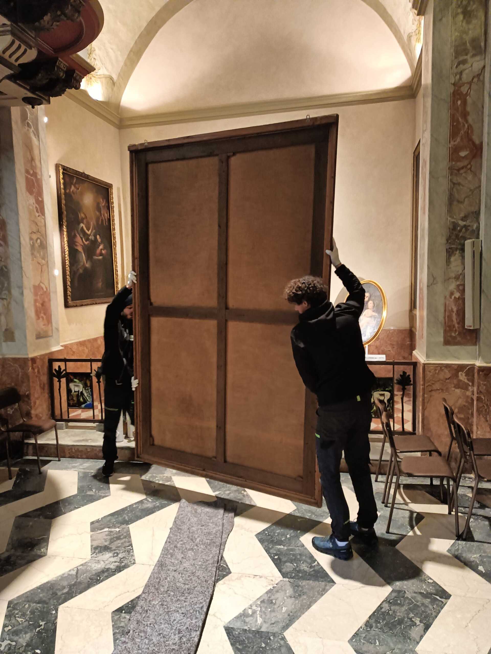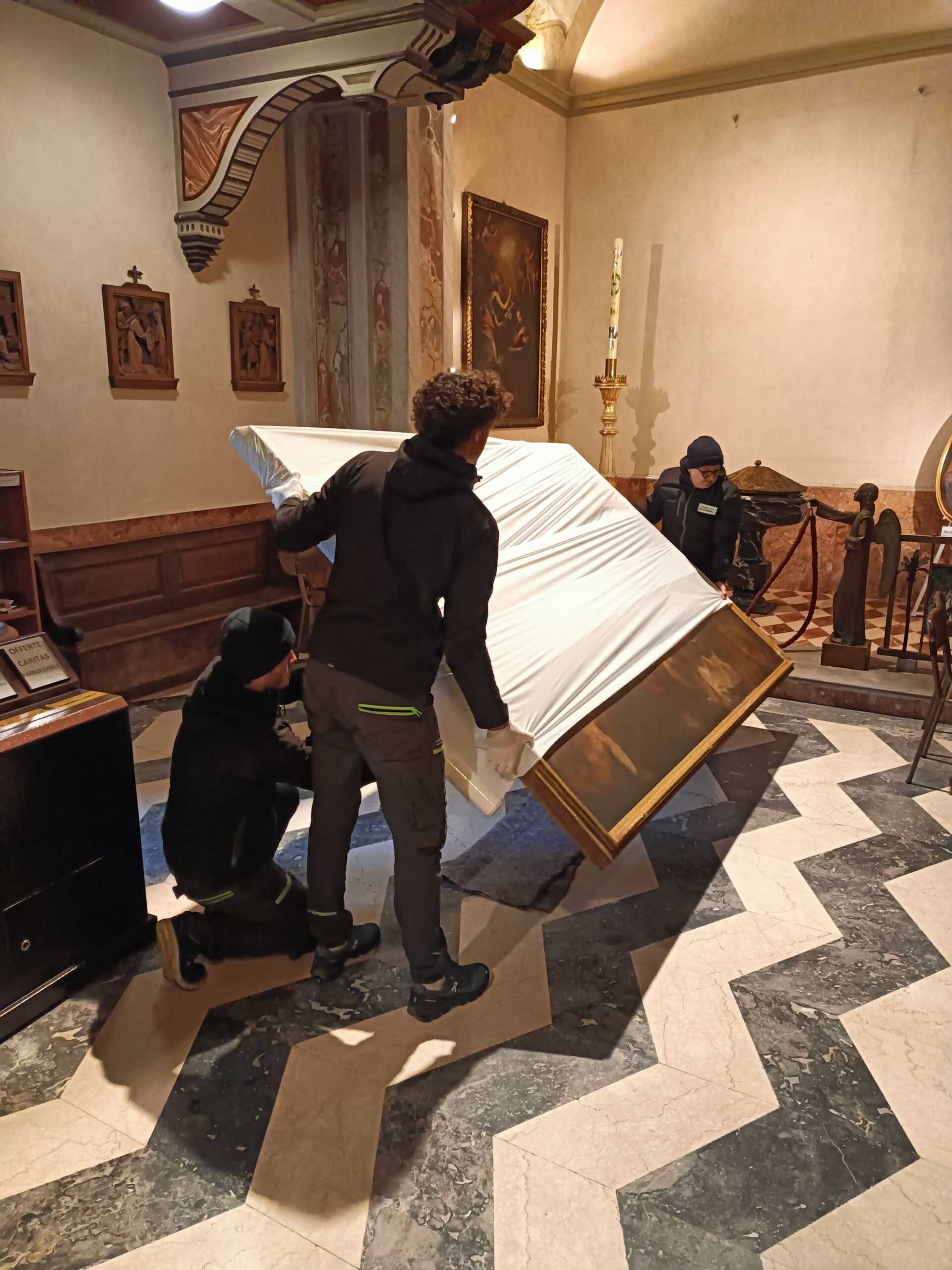 Ottenuto il via libera della Soprintendenza, l’opera è rimasta esposta fino alla fine di gennaio, in coincidenza con la rimozione del presepio che nel periodo natalizio ha animato la cappella facendo da cornice alla “nostra” tela. Mercoledì scorso la restauratrice Roberta Grazioli, di Bergamo, già autrice del restauro del polittico di Bernardino Luini conservato nella stessa chiesa, ha provveduto al prelievo dell’opera con l’ausilio di trasportatori specializzati, trasferendola nel proprio laboratorio bergamasco.