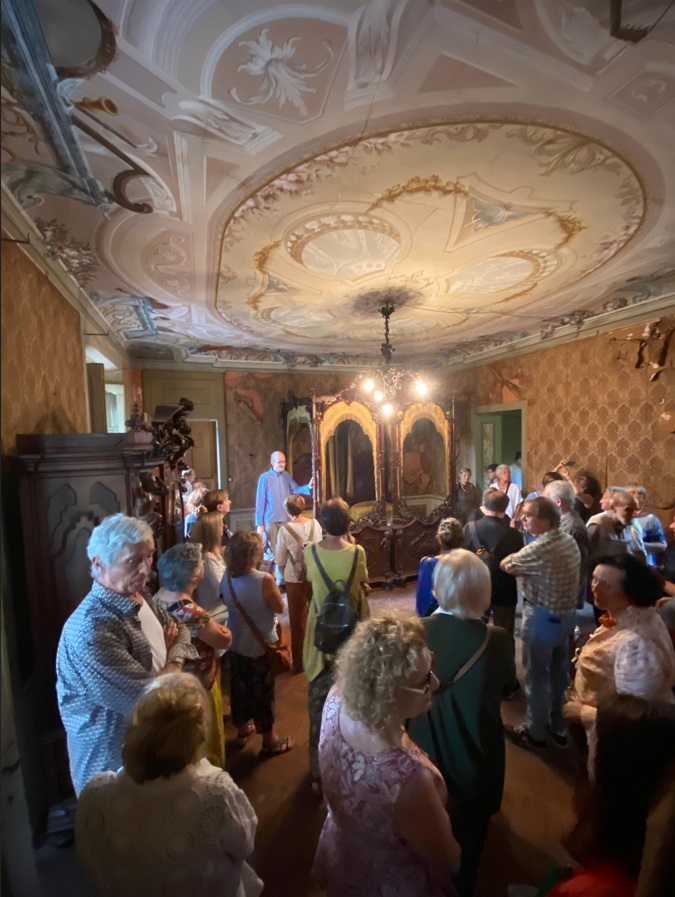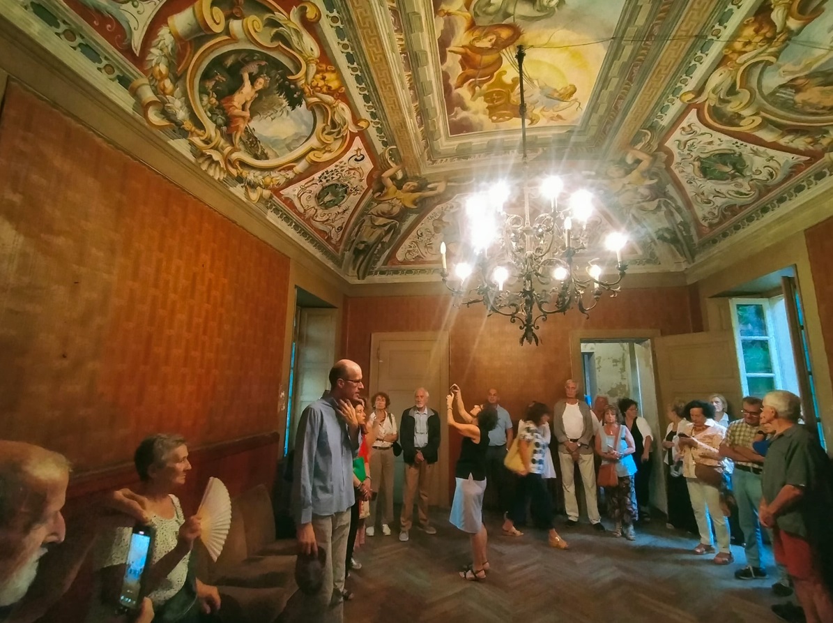 Il percorso è iniziato tra le sale affrescate dell’edificio, fondato nel XVI secolo e ampliato nei secoli successivi. L’elemento che più ha colpito l’immaginazione dei visitatori è stato il soffitto del salone nobile, decorato con scene mitologiche di grande impatto visivo.