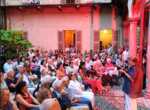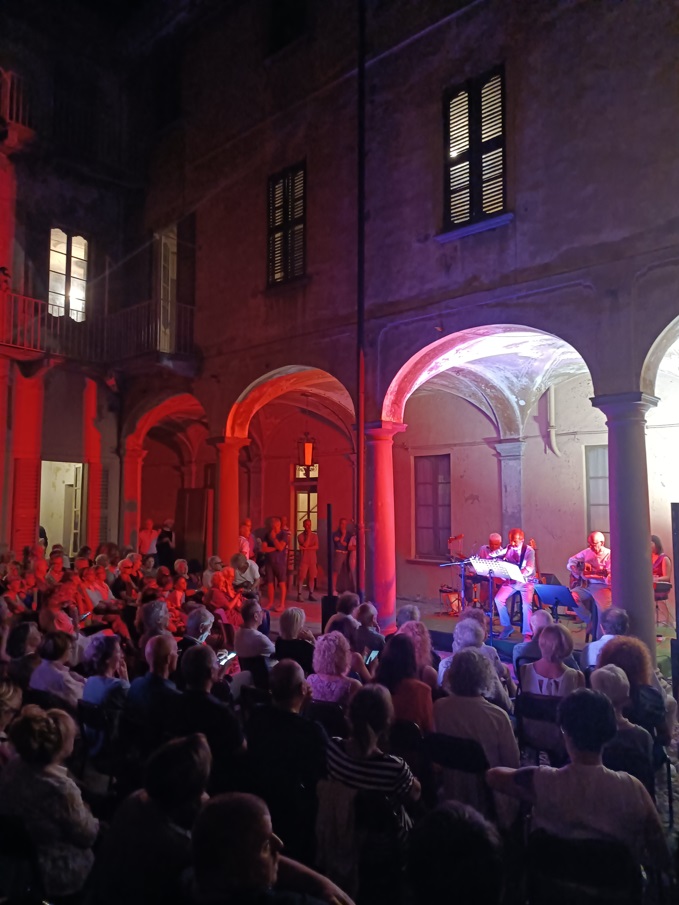 Dopo il tour guidato, gli ospiti si sono radunati nel cortile interno per assistere al momento performativo della serata. Protagonista sul “palco” il gruppo musicale Ambarabacciccicoccò, composto da Carlo e Margherita Santomassimo, Ezio e Valeria Sacchi, Daniele Caglio, con la presentazione dell’amica Gaetana Santini. Il repertorio ha spaziato da Fabrizio De André a Giorgio Gaber, passando per Paoli, Lauzi, Aznavour e Guccini. Musica d’autore, dunque, alternata a letture di pungenti aforismi firmati dal dermatologo Roberto Santini, a cui la serata è stata dedicata.
