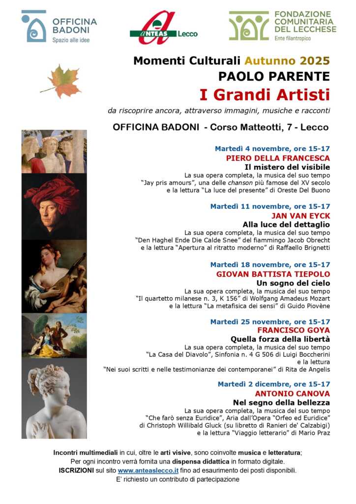 LECCO – Torna anche quest’anno “Momenti culturali – Autunno 2025”, il ciclo di incontri dedicato all’arte e alla cultura promosso da Anteas Lecco ODV, ormai giunto alla quinta edizione. Un percorso che intreccia pittura, musica e letteratura, guidando il pubblico alla scoperta di cinque grandi maestri dell’arte europea: Piero della Francesca, Jan Van Eyck, Giovan Battista Tiepolo, Francisco Goya e Antonio Canova.