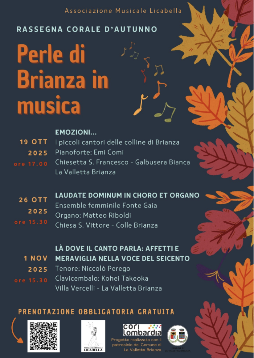 LA VALLETTA BRIANZA – L’Associazione Musicale Licabella presenta “Perle di Brianza in musica”, una rassegna d’autunno in 3 appuntamenti dedicati alla musica corale e vocale, ospitati in alcuni dei luoghi più suggestivi della Brianza lecchese. Con il patrocinio del Comune di La Valletta Brianza, la mini rassegna propone un percorso tra arte, storia e natura, con l’obiettivo di valorizzare luoghi simbolo del territorio e farli rivivere attraverso la musica.