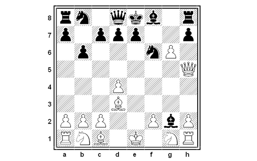 1.e4 b6 2.d4 Ab7 3.Ad3 f5 4.exf5 Axg2 5.Dh5+ g6 6.fxg6 Cf6 ed ora il bianco vince con un bel sacrificio di Donna