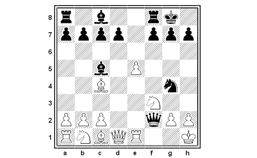 De7 7.d4 exd4 8.e5 Cg4 9.cxd4 Cxd4 10.Cxd4 Dh4 11.Cf3 Dxf2+ 12.Rh1