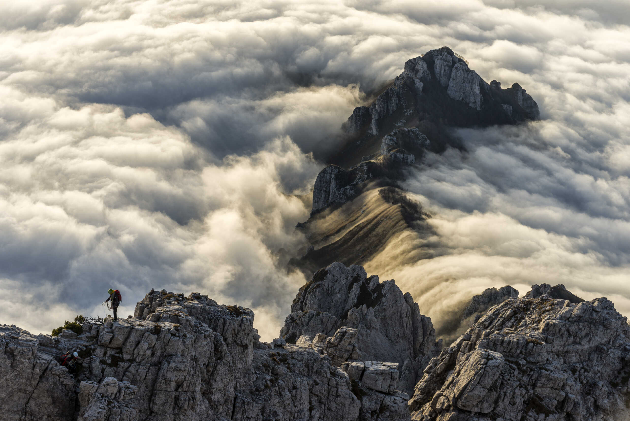 Mauro Lanfranchi ha realizzato l’immagine che è stata premiata in vetta alla Grignetta dove si era recato per immortalare il tramonto: “C’era un bellissimo mare di nubi che improvvisamente si è trasformato in una suggestiva cascata di nebbie. Ciliegina sulla torta due alpinisti apparsi sulla cresta Segantini che si stagliavano sullo sfondo. A volte, un po’ di fortuna non guasta”.
