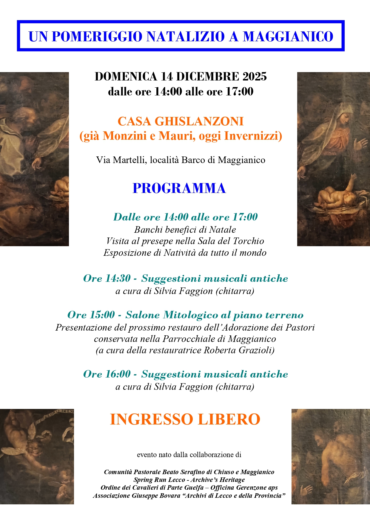 L’iniziativa, libera e aperta a tutti, nasce dalla collaborazione tra Comunità Pastorale Beato Serafino di Chiuso e Maggianico, Spring Run Lecco, Officina Gerenzone aps, Archive’s Heritage, Ordine dei Cavalieri di Parte Guelfa, Associazione Giuseppe Bovara – “Archivi di Lecco e della Provincia”. Si ringrazia la famiglia Invernizzi che, come sempre, concede con grande generosità Casa Ghislanzoni.