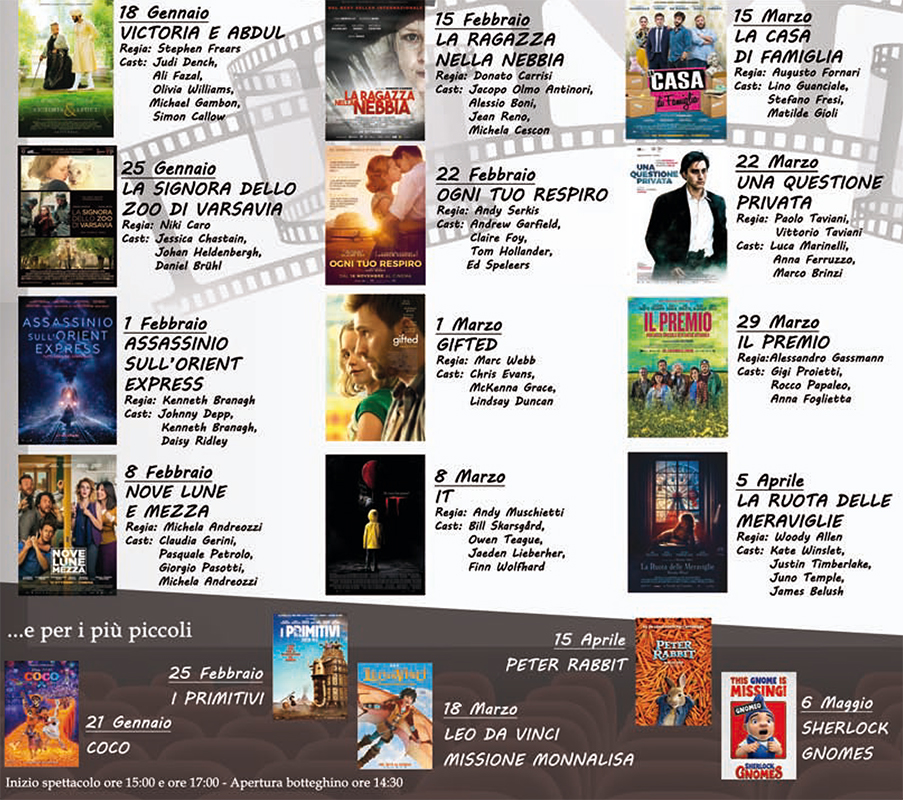 Dodici pellicole che ci accompagneranno verso la primavera, con i titoli più in vista tra le ultime uscite, al prezzo di 5 euro al biglietto e 35 euro per abbonamento (ridotto a 30 euro per gli associati alla Pro Loco). L’abbonamento è in vendita presso la biglietteria del cinema e presso la Pro Loco in via Manzoni 57, martedì dalle 21 alle 23 e venerdì dalle 15.30 alle 18.30.