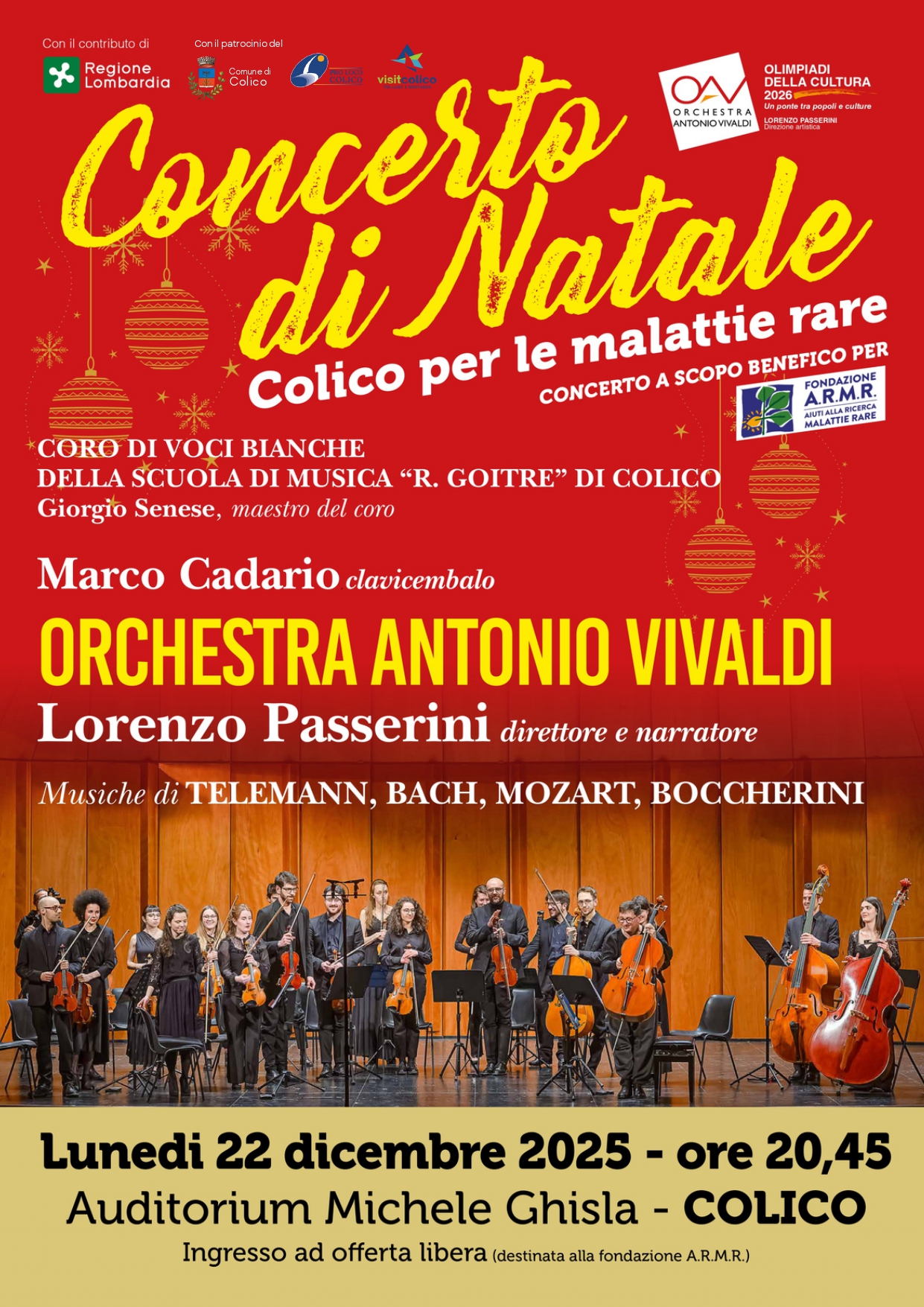 COLICO – Lunedì 22 dicembre, alle ore 20.45, l’auditorium Michele Ghisla di Colico accoglierà il pubblico per il Concerto di Natale “Colico per le malattie rare”, un appuntamento di alto profilo artistico e umano, promosso con il patrocinio del Comune di Colico. L’evento, a ingresso a offerta libera, è organizzato a scopo benefico dalla delegazione di Colico della Fondazione ETS A.R.M.R. e il ricavato sarà destinato alla Fondazione per gli aiuti alla ricerca sulle malattie rare.