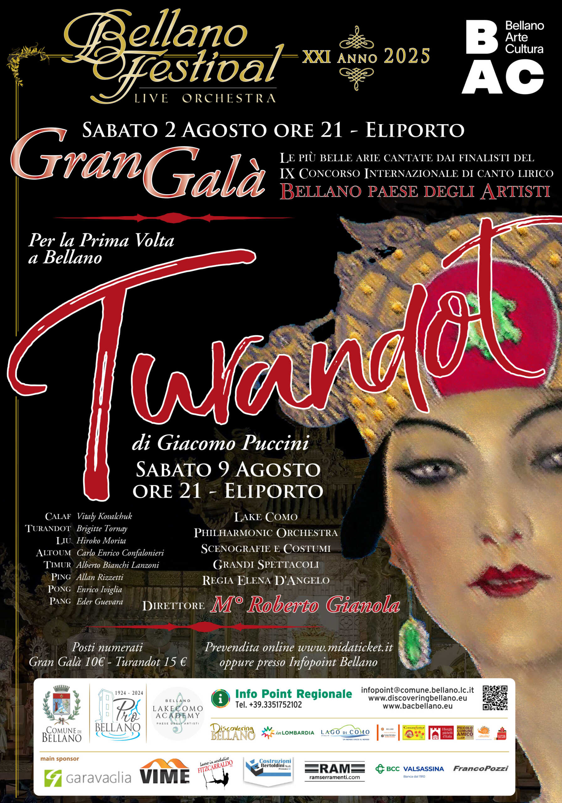 I biglietti per il Gran Galà (posto unico 10 euro) e per Turandot di G. Puccini (posto unico 15 euro) sono disponibili online su www.midaticket.it oppure in prevendita presso l’Infopoint di Bellano, in via Vittorio Veneto 23.