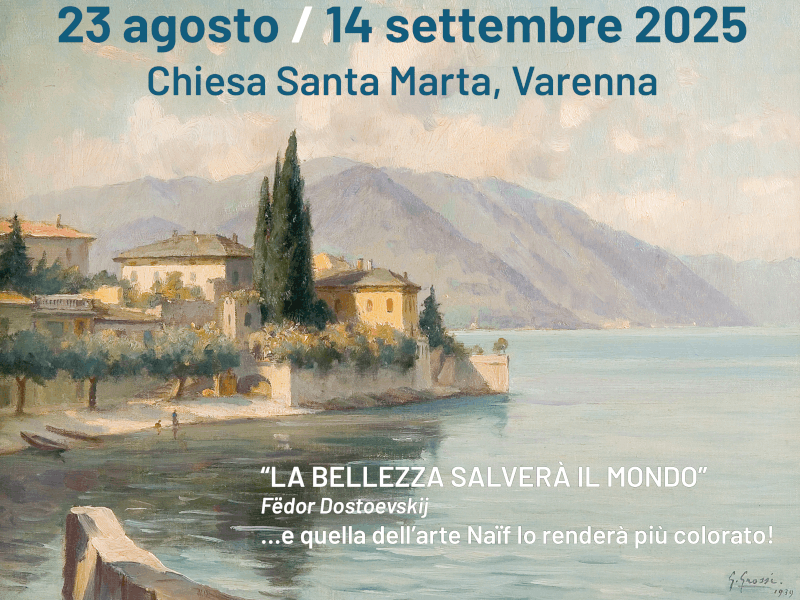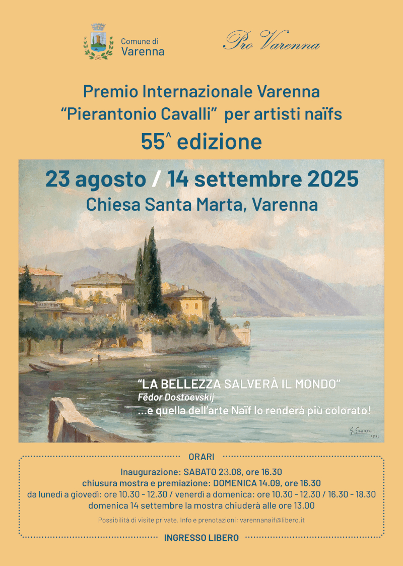 55^ edizione del Premio Internazionale Varenna di Arte Naïf “Pierantonio Cavalli” intitolata “La bellezza salverà il mondo” (F. Dostoevskij)… e quella dell’arte naïf lo renderà più colorato! Dal 23 agosto al 14 settembre 2025. Chiesa di Santa Marta, Piazza S. Giorgio 25, a Varenna. La mostra, organizzata dalla Pro Varenna e patrocinata dal Comune di Varenna, sarà curata da Norma Cavalli.